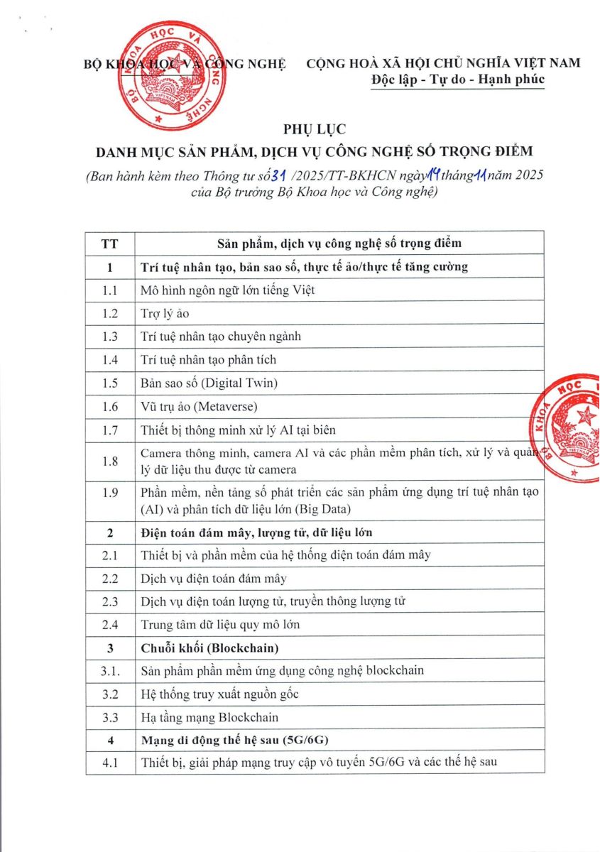 Ngày 14 tháng 11 năm 2025, Bộ Khoa học và Công nghệ đã ban hành Thông tư số 31/2025/TT-BKHCN quy định Danh mục sản phẩm, dịch vụ công nghệ số trọng điểm, nhằm đáp ứng yêu cầu phát triển công nghiệp công nghệ số, thúc đẩy đổi mới sáng tạo và nâng cao năng lực cạnh tranh quốc gia trong bối cảnh chuyển đổi số.