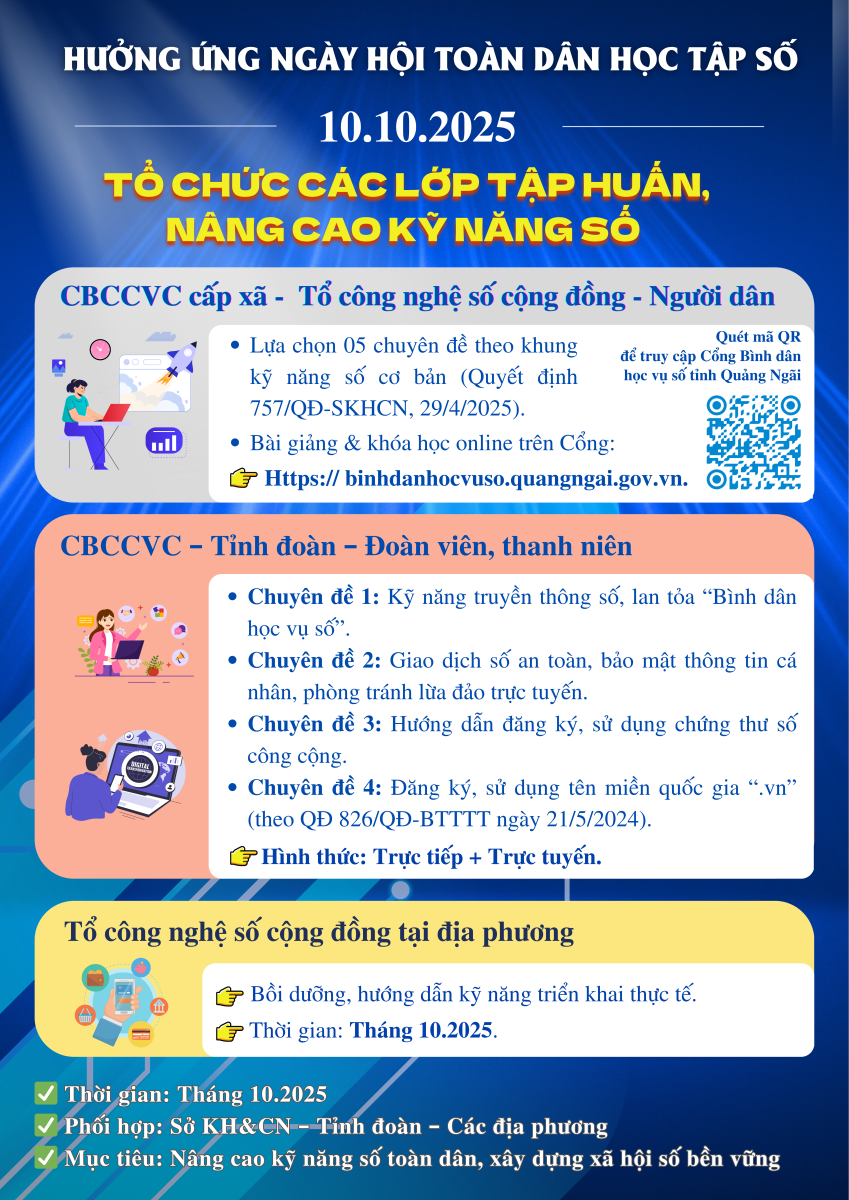 Các địa phương trên địa bàn tỉnh Quảng Ngãi đang đồng loạt triển khai phong trào “Bình dân học vụ số”, “Ngày hội toàn dân học tập số” và các hoạt động hưởng ứng Ngày Chuyển đổi số Quốc gia (10/10), nhằm mục tiêu trang bị kỹ năng số cơ bản cho toàn dân và thúc đẩy mạnh mẽ tiến trình chuyển đổi số. (Xem tiếp tại đây)