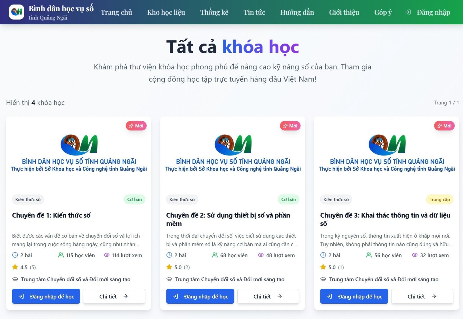 Giao diện các khóa học tại Cổng Bình dân học vụ số tỉnh Quảng Ngãi