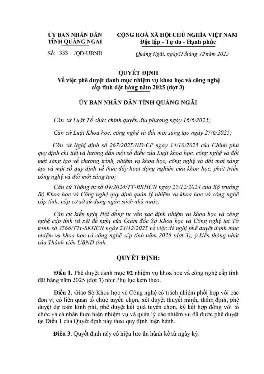 Quyết định về việc phê duyệt danh mục nhiệm vụ khoa học và công nghệ cấp tỉnh đặt hàng năm 2025 (đợt 3)
