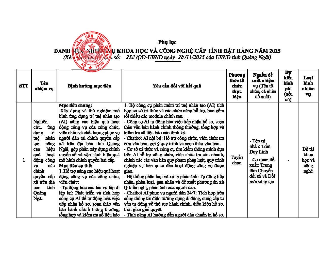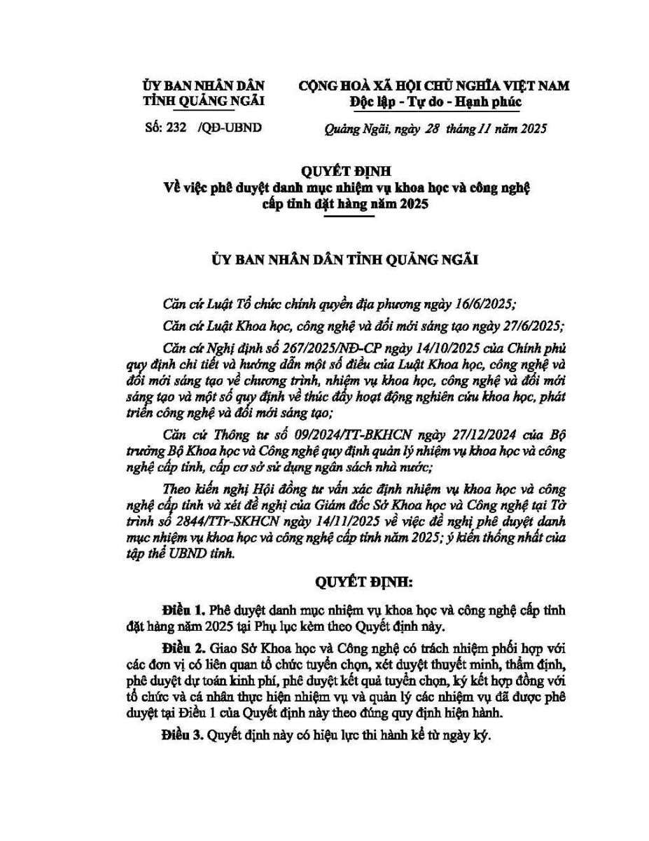 Quyết định về việc phê duyệt danh mục nhiệm vụ khoa học và công nghệ cấp tỉnh đặt hàng năm 2025
