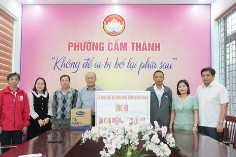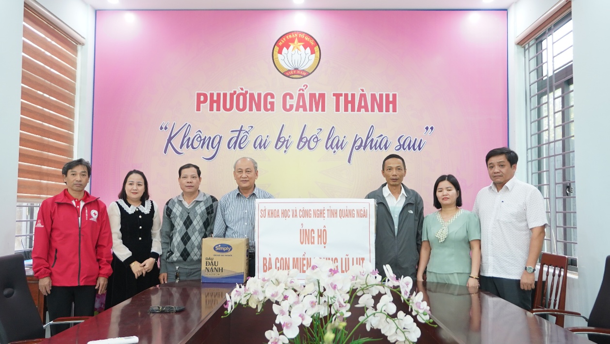 Chiều ngày 27/11, tại Ủy ban Mặt trận Tổ quốc Việt Nam phường Cẩm Thành, tỉnh Quảng Ngãi, Sở Khoa học và Công nghệ đã tổ chức trao tặng các nhu yếu phẩm gồm: 03 tạ gạo, 05 thùng dầu ăn, 05 thùng nước mắm và 50 ram vở học sinh để kịp thời hỗ trợ đồng bào vùng lũ. Toàn bộ số quà được tiếp nhận thông qua Ủy ban Mặt trận Tổ quốc Việt Nam phường Cẩm Thành để chuyển đến tận tay người dân bị ảnh hưởng.