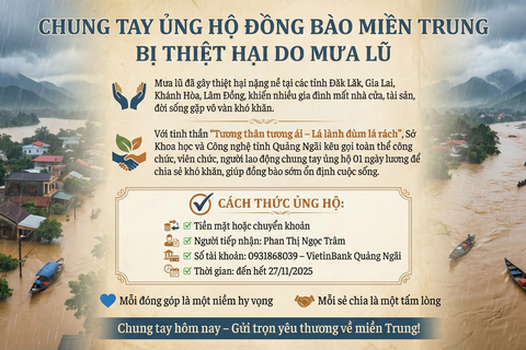 Với tinh thần “Tương thân tương ái – Lá lành đùm lá rách”, toàn thể công chức, viên chức, người lao động Sở Khoa học và Công nghệ tỉnh Quảng Ngãi đã chung tay quyên góp, ủng hộ 01 ngày lương, nhằm sẻ chia khó khăn với đồng bào vùng thiên tai, góp phần giúp bà con sớm ổn định đời sống và khôi phục sản xuất.