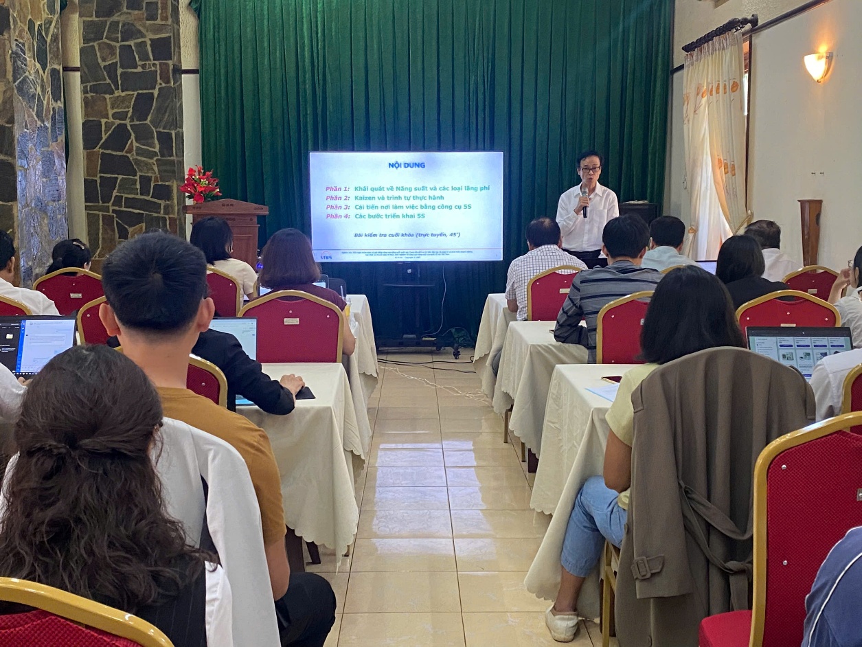 Học viên được Chuyên gia về năng suất chất lượng ông Nguyễn Ngọc Thi, Giám đốc Viện Năng suất Việt Nam (Chi nhánh tại Đà Nẵng), trực tiếp giảng dạy các nội dung trọng tâm như: Khái niệm về năng suất và các loại lãng phí (Muda – Mura – Muri); Kaizen – triết lý cải tiến liên tục và trình tự thực hành Kaizen; các phương pháp, kỹ thuật hỗ trợ Kaizen và 7 bước triển khai cơ bản; thực hành cải tiến nơi làm việc bằng công cụ 5S: Sàng lọc – Sắp xếp – Sạch sẽ – Săn sóc – Sẵn sàng.