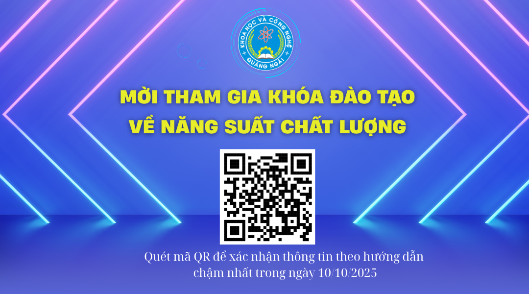 Sở Khoa học và Công nghệ tỉnh Quảng Ngãi phối hợp với Viện Năng suất Việt Nam – Chi nhánh Đà Nẵng sẽ tổ chức Khóa đào tạo về năng suất chất lượng nhằm hỗ trợ doanh nghiệp, hợp tác xã, tổ chức và cơ sở giáo dục nâng cao năng lực cải tiến năng suất, hướng đến mô hình quản lý hiện đại và hiệu quả.