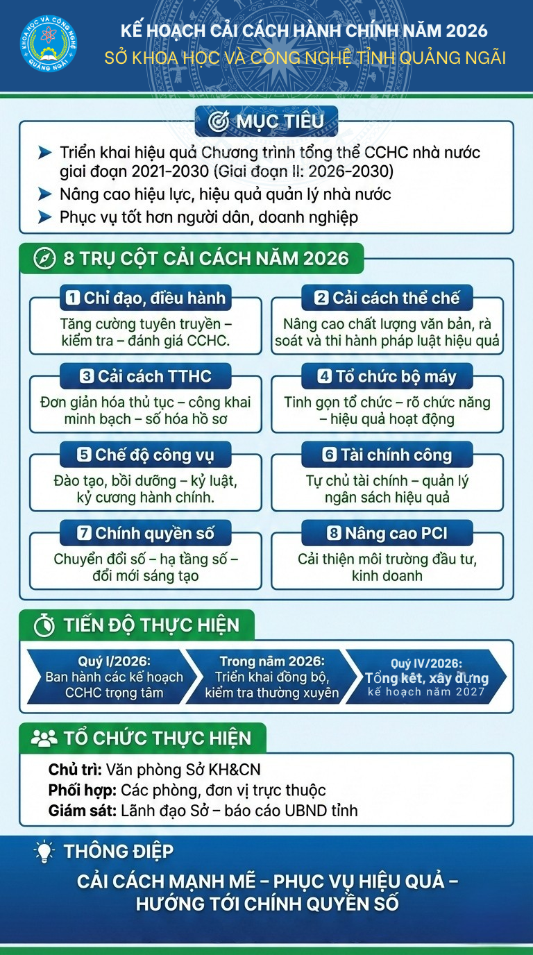 Chủ nhật, 04/01/2026 | 21:02 A- A A+ | INF0GRAPHIC - Kế hoạch cải cách hành chính năm 2026 của Sở Khoa học và Công nghệ 04/01/2026, 21:02 |