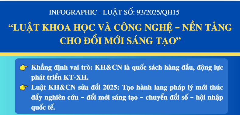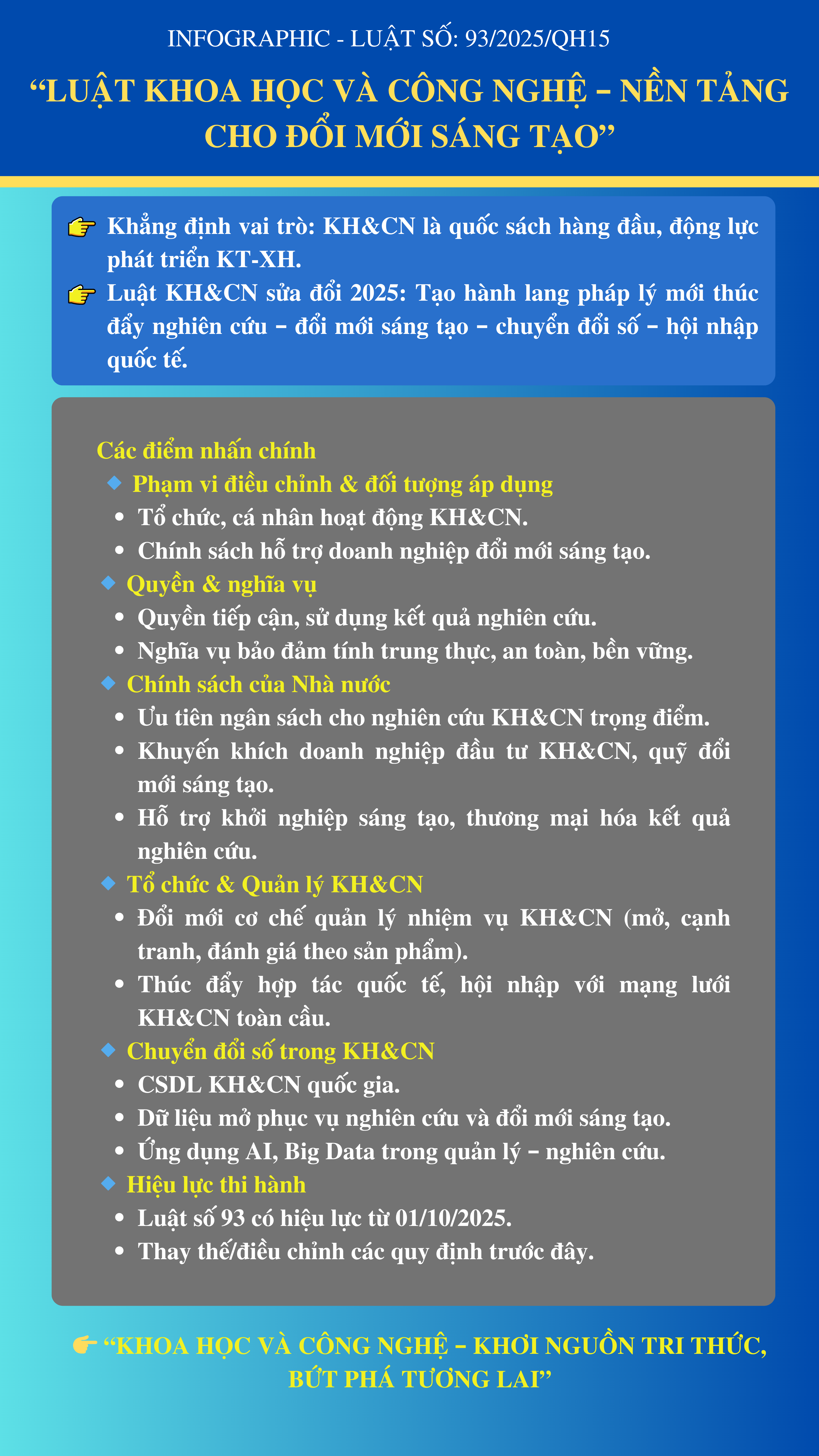 Thứ sáu, 03/10/2025 | 09:19 A- A A+ | infographic - Luật số 93/2025/QH15: Luật Khoa học, công nghệ và Đổi mới sáng tạo 03/10/2025, 09:19 |