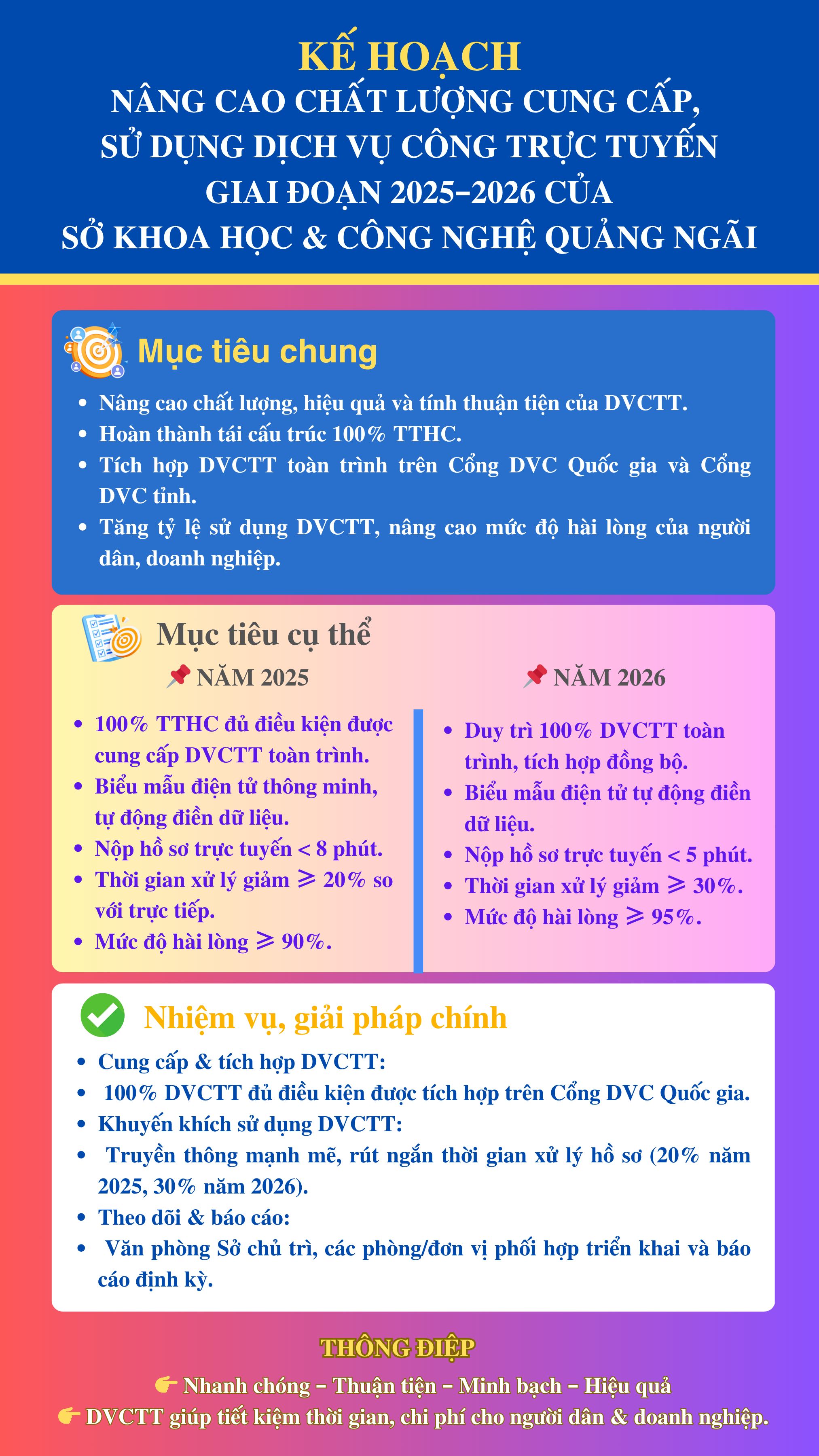 Thứ sáu, 03/10/2025 | 08:45 A- A A+ | Kế hoạch hành động nâng cao chất lượng cung cấp, sử dụng dịch vụ công trực tuyến giai đoạn 2025-2026 của Sở Khoa học và Công nghệ 03/10/2025, 08:45 |