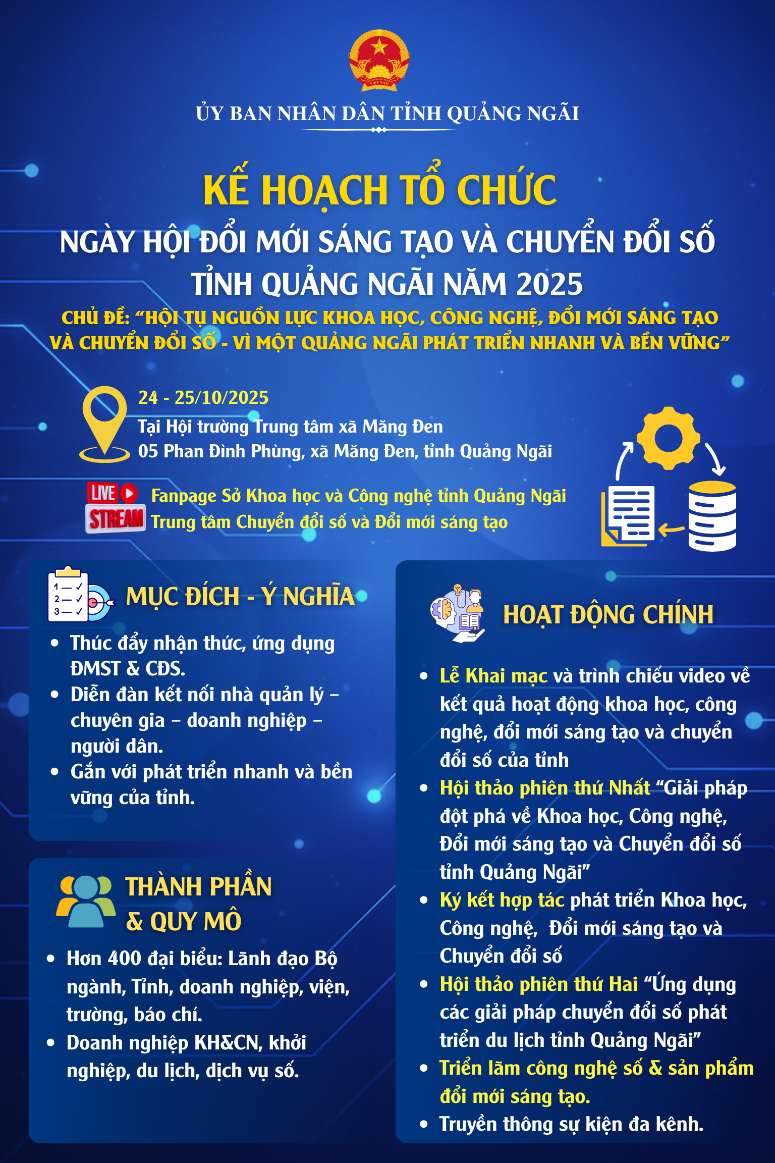 Chủ nhật, 19/10/2025 | 11:05 A- A A+ | Kế hoạch tổ chức Ngày hội Đổi mới sáng tạo và Chuyển đổi số tỉnh Quảng Ngãi năm 2025 19/10/2025, 11:05 |