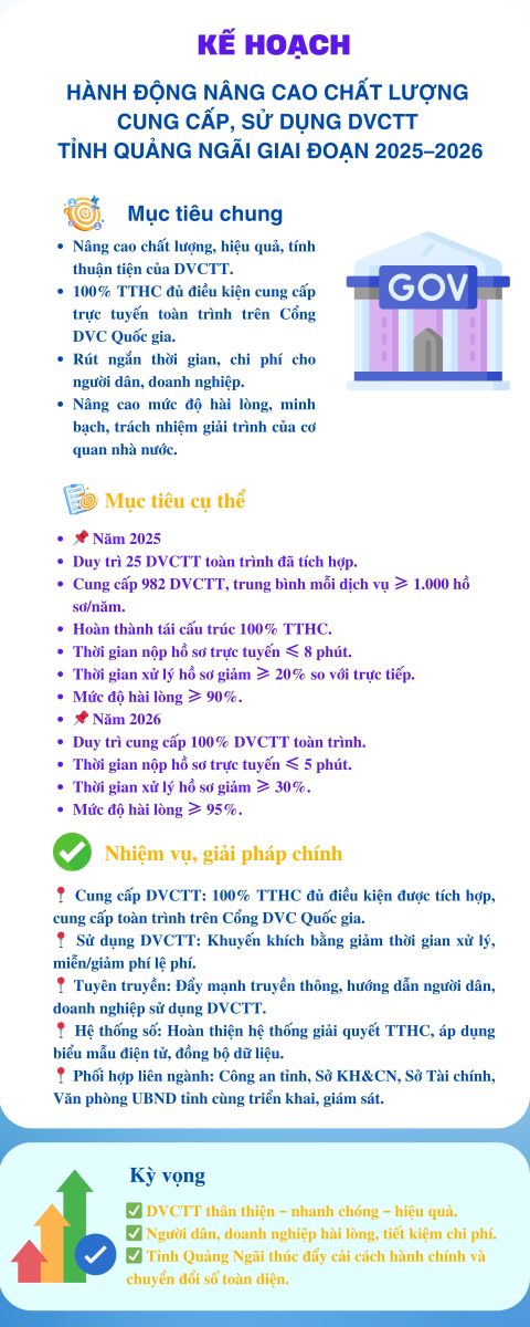 Kế hoạch hành động nâng cao chất lượng cung cấp, sử dụng DVCTT tỉnh Quảng Ngãi giai đoạn 2025–2026