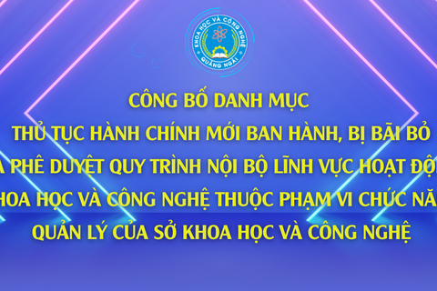 Công bố Danh mục thủ tục hành chính mới ban hành, bị bãi bỏ và phê duyệt Quy trình nội bộ lĩnh vực Hoạt động khoa học và công nghệ thuộc phạm vi chức năng quản lý của Sở Khoa học và Công nghệ Sở Khoa học và Công nghệ