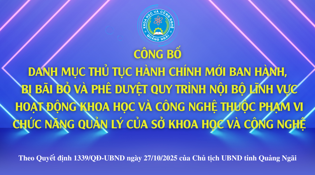 Thứ ba, 28/10/2025 | 10:05 A- A A+ | Quyết định 1339/QĐ-UBND về việc Công bố Danh mục thủ tục hành chính mới ban hành, bị bãi bỏ và phê duyệt Quy trình nội bộ lĩnh vực Hoạt động khoa học và công nghệ thuộc phạm vi chức năng quản lý của Sở Khoa học và Công nghệ Lưu Quyết định 1339/QĐ-UBND ngày 27/10/2025 của Chủ tịch UBND tỉnh Quảng NgãiPhụ lục I theo Quyết định 1339/QĐ-UBNDPhụ lục II theo Quyết định 1339/QĐ-UBND