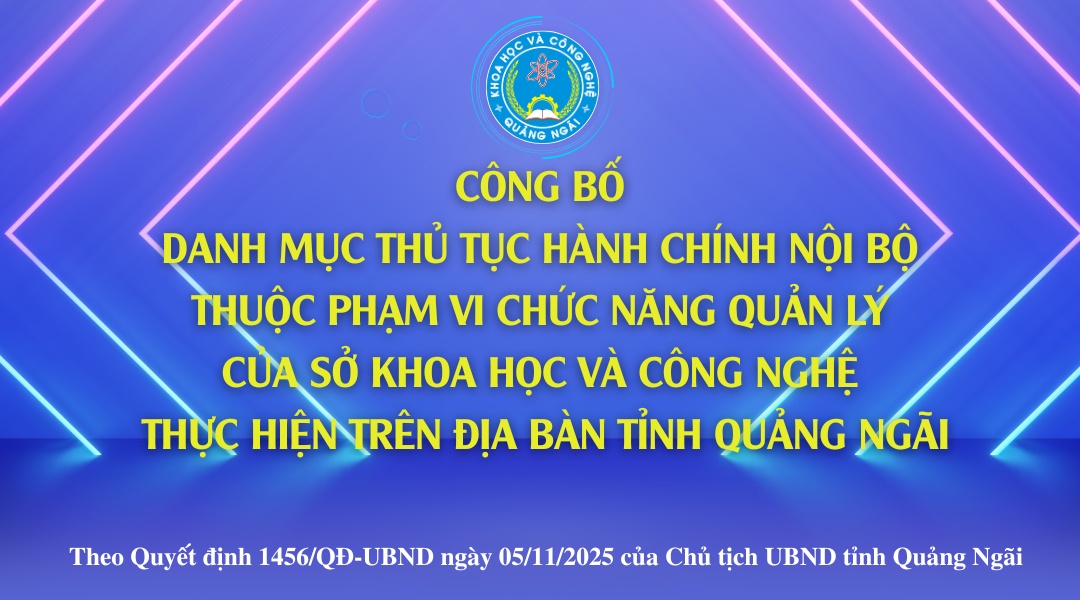 Thứ năm, 06/11/2025 | 09:22 A- A A+ | Quyết định 1456/QĐ-UBND về việc Công bố Danh mục thủ tục hành chính nội bộ thuộc phạm vi chức năng quản lý của Sở Khoa học và Công nghệ thực hiện trên địa bàn tỉnh Quảng Ngãi Lưu Quyết định 1456/QĐ-UBND ngày 05/11/2025 của Chủ tịch UBND tỉnh Quảng NgãiPhụ lục Danh mục thủ tục hành chính nội bộ thuộc phạm vi chức năng quản lý của Sở Khoa học và Công nghệ thực hiện trên địa bàn tỉnh Quảng Ngãi