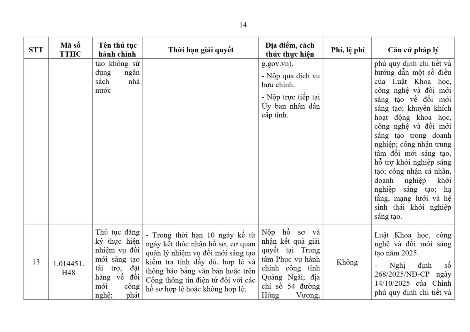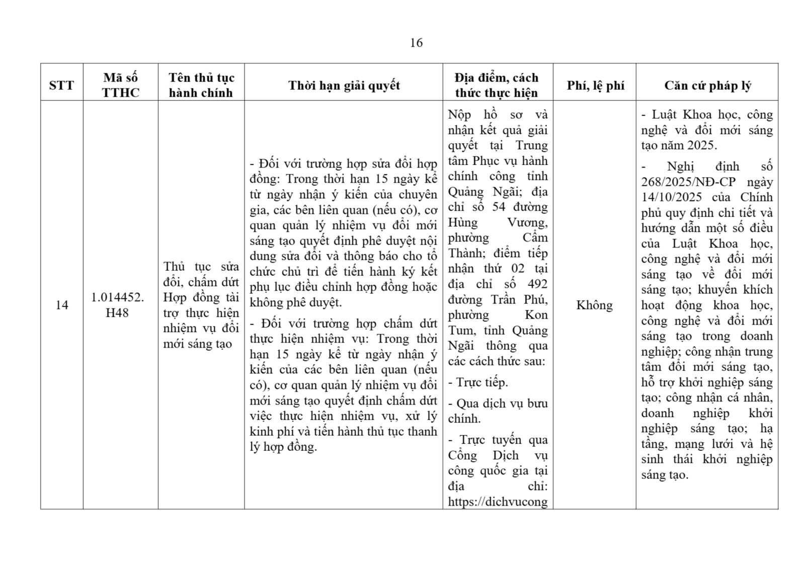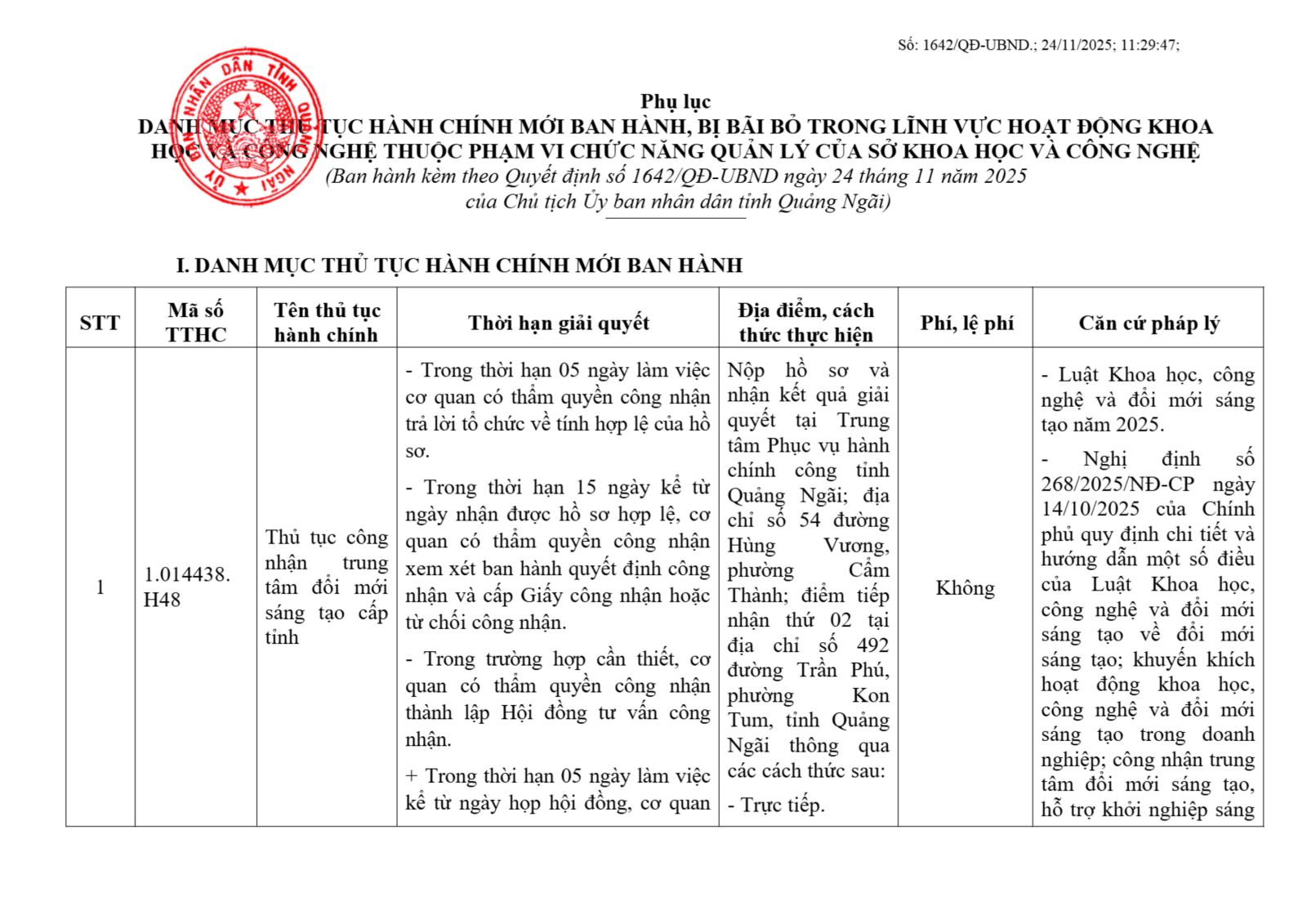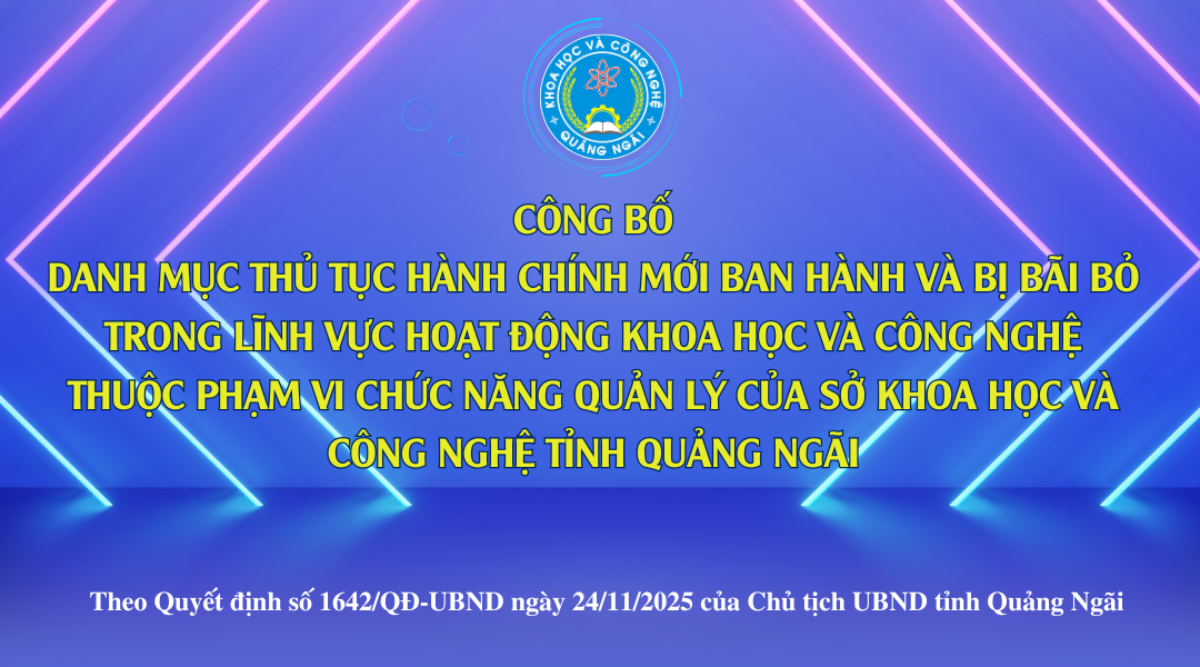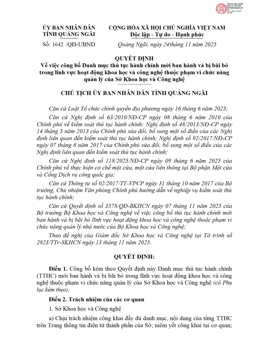 Quyết định số 1642/QĐ-UBND ngày 24/11/2025 của Chủ tịch UBND tỉnh Quảng Ngãi về việc Công bố Danh mục thủ tục hành chính mới ban hành và bị bãi bỏ trong lĩnh vực hoạt động khoa học và công nghệ thuộc phạm vi chức năng quản lý của Sở Khoa học và Công nghệ