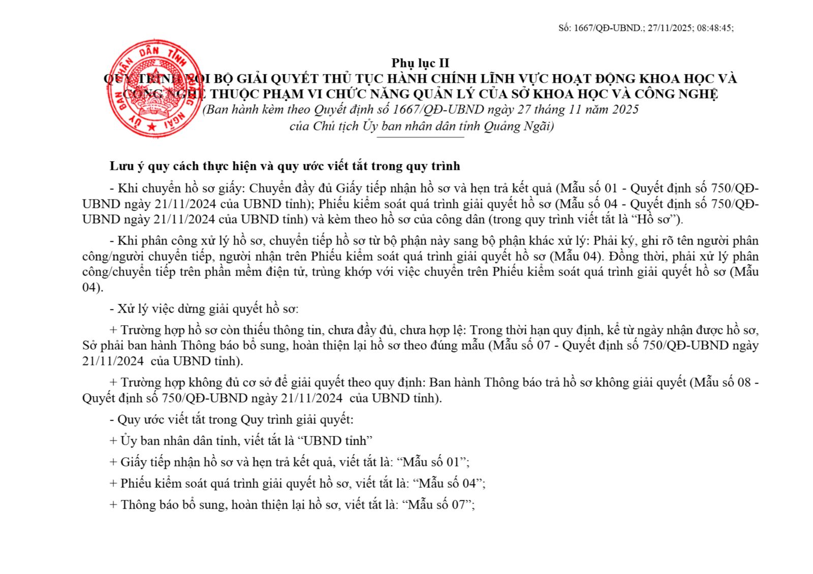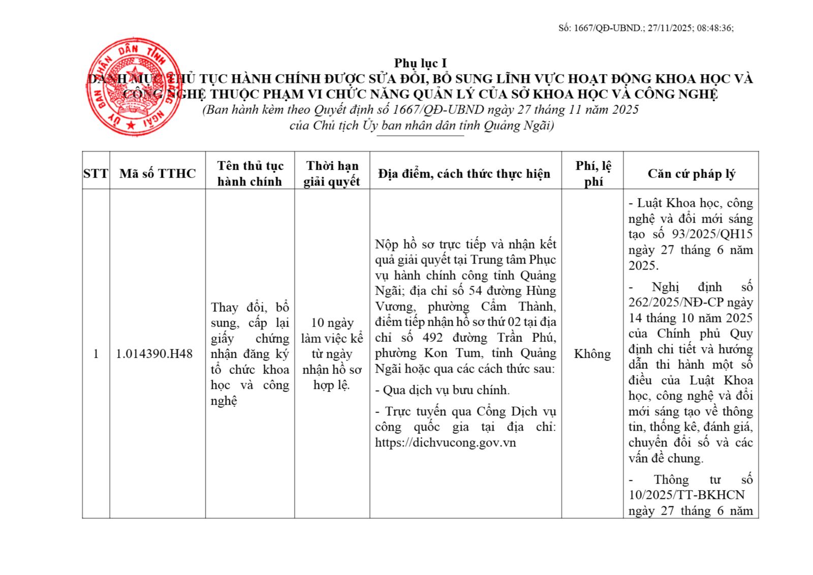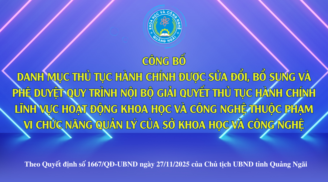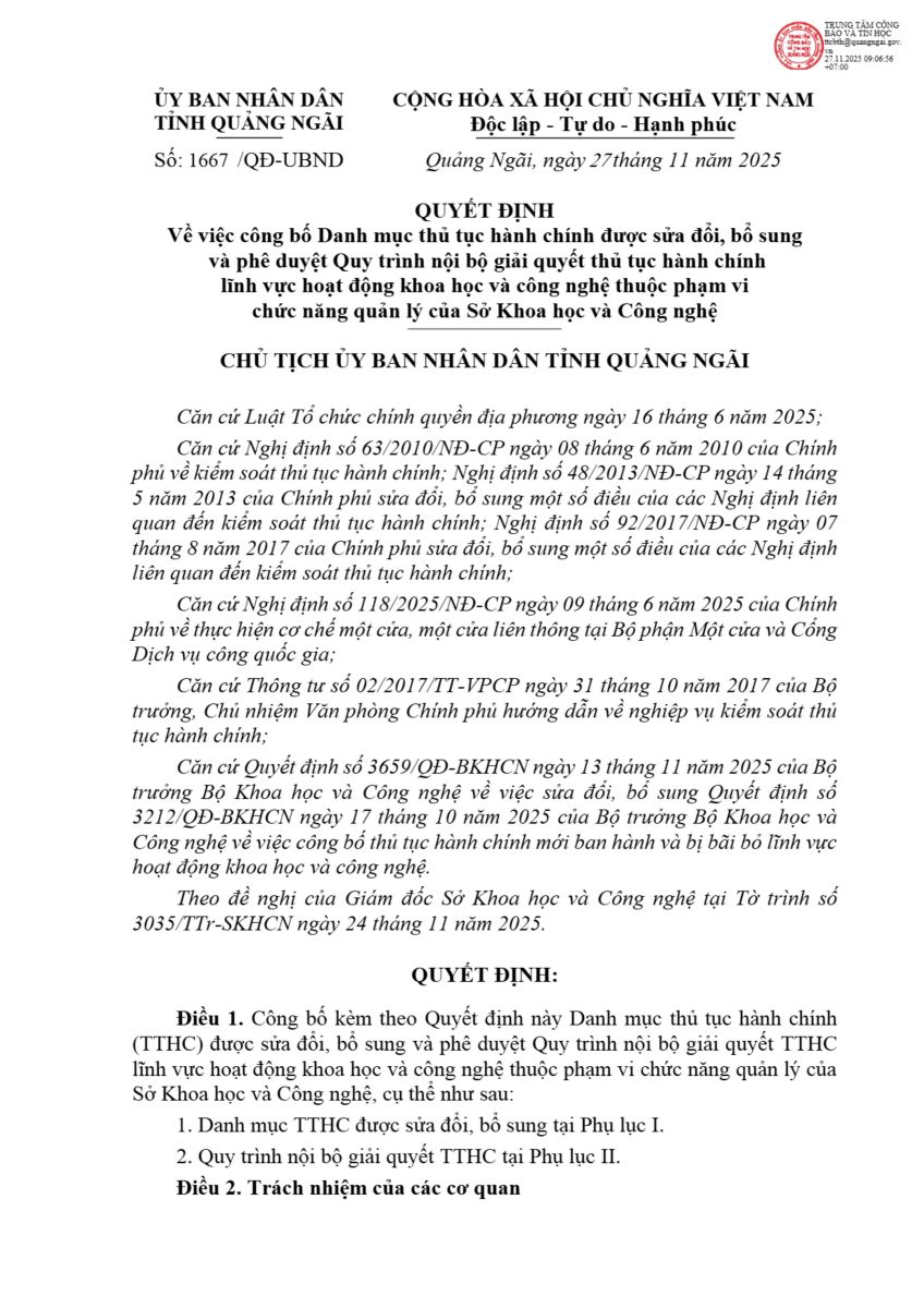 Quyết định số 1667/QĐ-UBND ngày 27/11/2025 của Chủ tịch UBND tỉnh Quảng Ngãi về việc công bố Danh mục thủ tục hành chính được sửa đổi, bổ sung và phê duyệt Quy trình nội bộ giải quyết thủ tục hành chính lĩnh vực hoạt động khoa học và công nghệ thuộc phạm vi chức năng quản lý của Sở Khoa học và Công nghệ