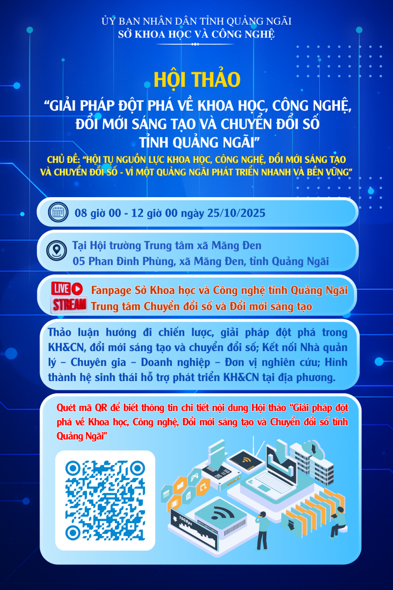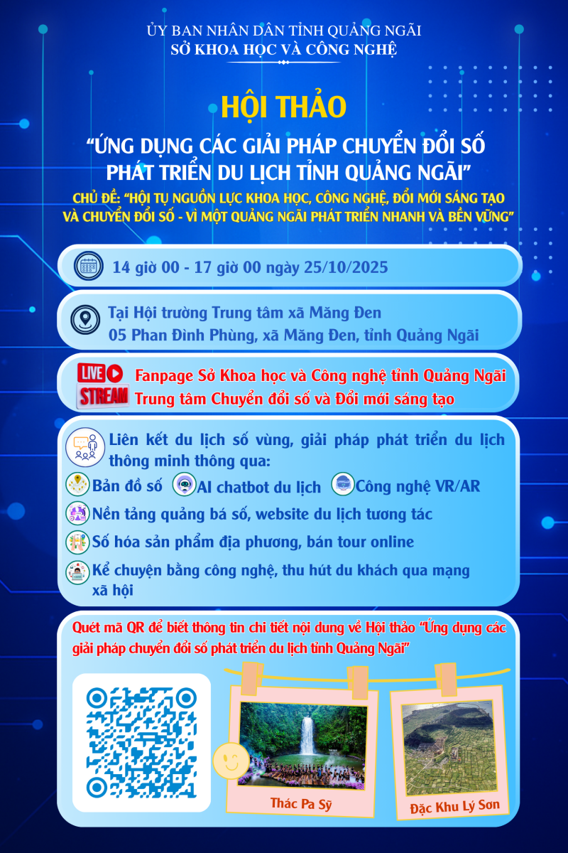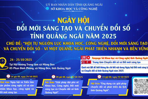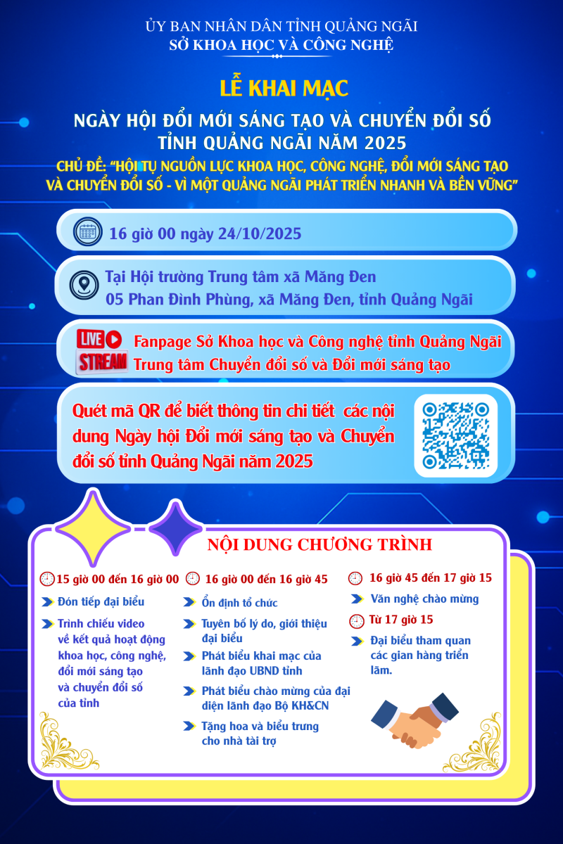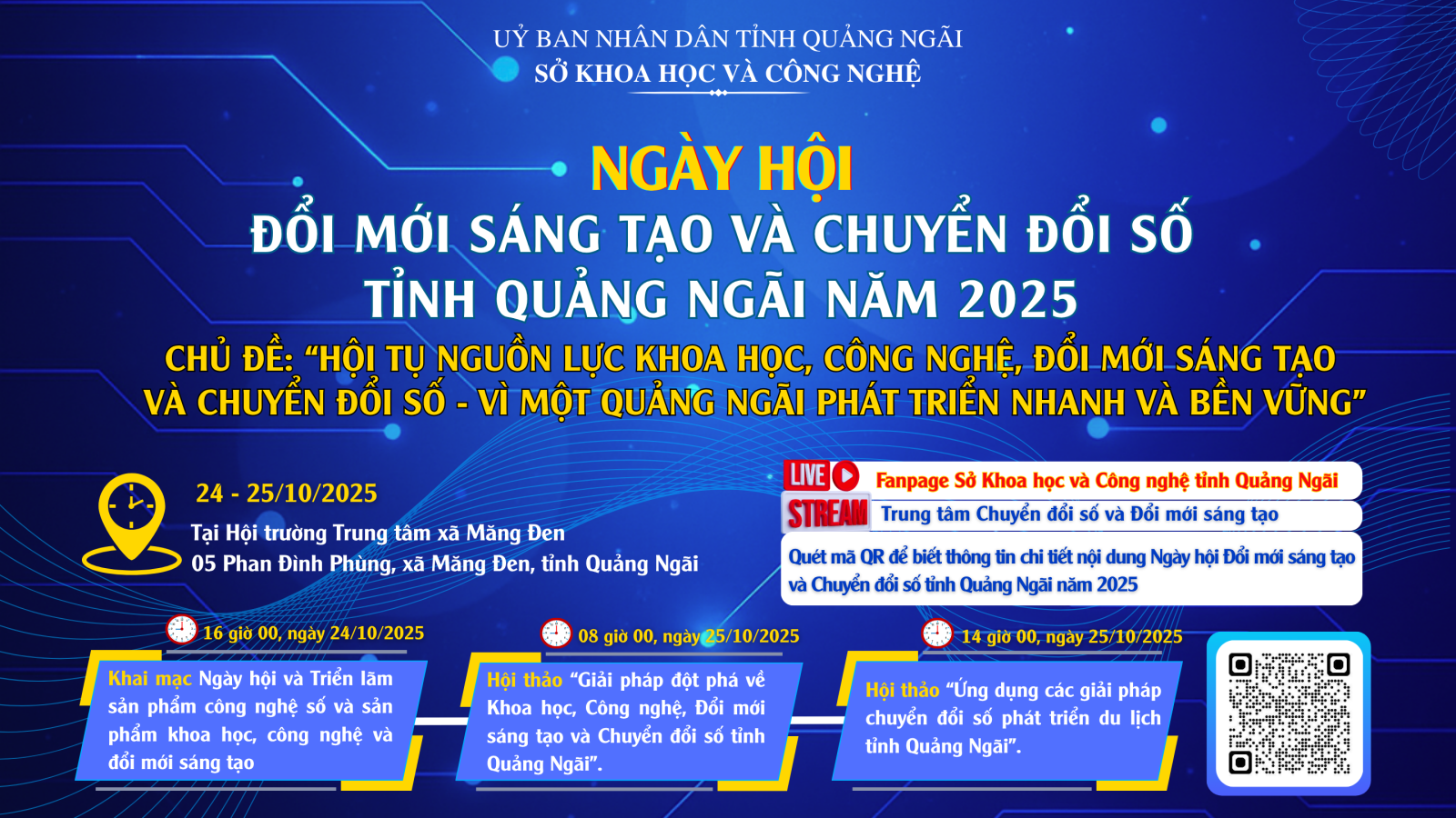 Ngày 15/09/2025, UBND tỉnh Quảng Ngãi ban hành Kế hoạch số 45/KH-UBND về tổ chức Ngày hội Đổi mới sáng tạo và Chuyển đổi số tỉnh Quảng Ngãi năm 2025 với chủ đề “Hội tụ nguồn lực Khoa học, Công nghệ, Đổi mới sáng tạo và Chuyển đổi số – Vì một Quảng Ngãi phát triển nhanh và bền vững” tại xã Măng Đen từ ngày 24-25/10/2025